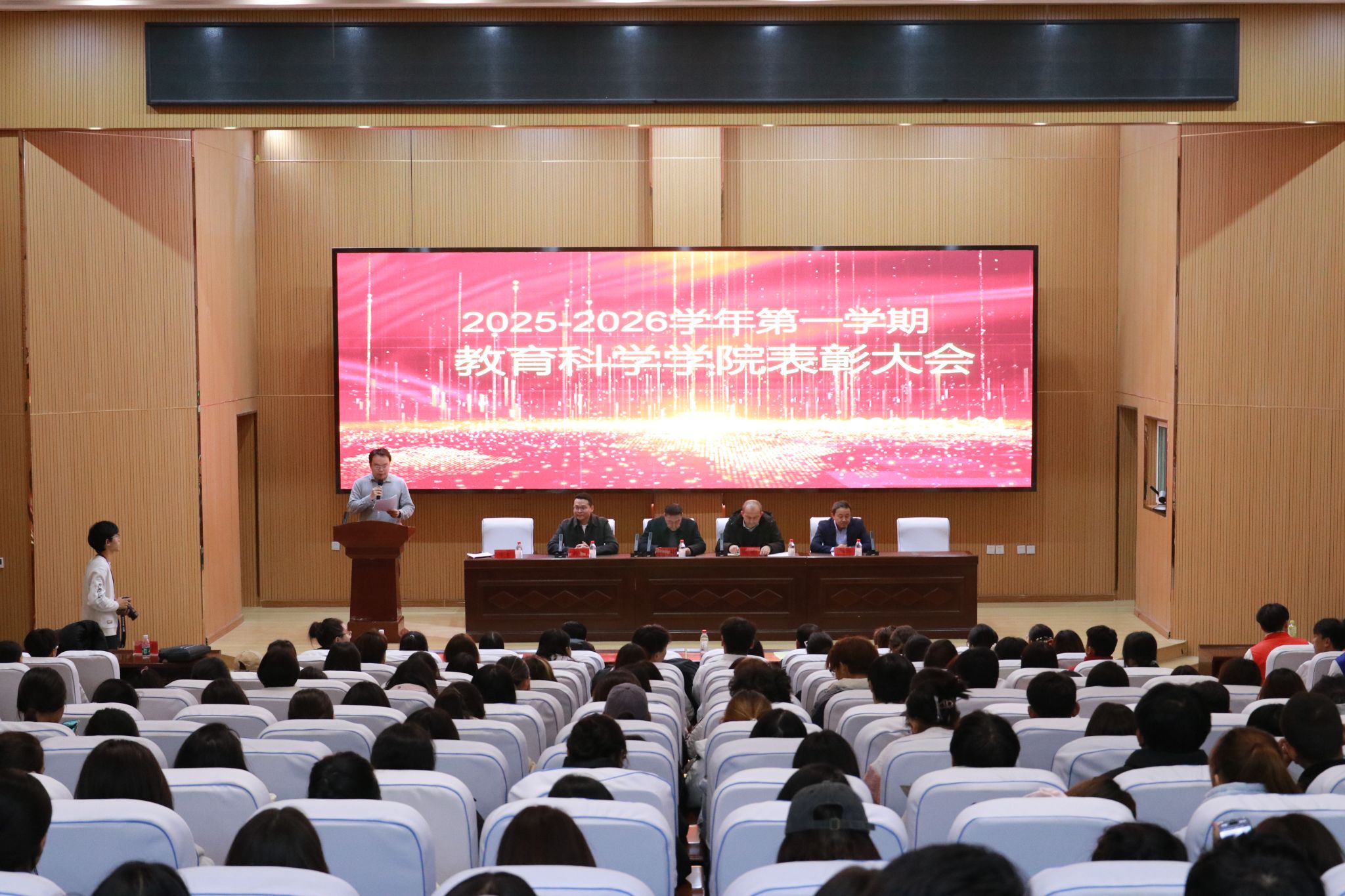 为落实新时代立德树人工程,充分发挥榜样示范引领作用,11月24日,教育科学学院2025-2026学年第一学期表彰大会在我校昆仑路校区图书馆报告厅举行。教育科学学院党总支副书记、院长买提肉孜·马合木提、学工部副部长阿布都肉苏力·阿布都力木、教育科学学院党总支副书记程爽、教育科学学院副院长胡荣华参加大会。会议由教育科学学院学工办主任王非主持。