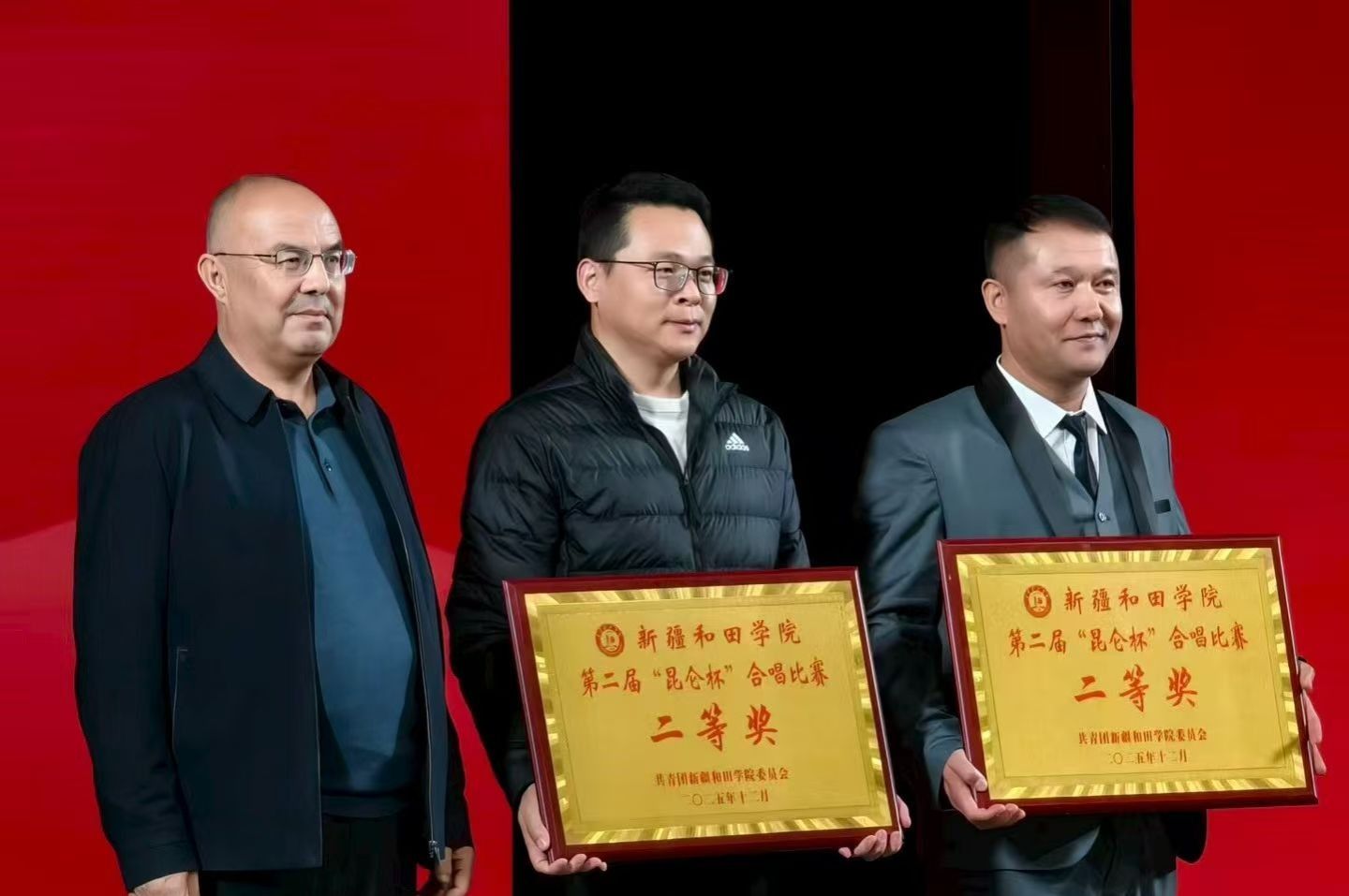 当昆仑山脉的晨光洒满和田大地,当和田河的波浪奏响冬日的序曲,12月3日,新疆和田学院“昆仑杯”合唱比赛在和田县影剧院举行。新疆和田学院教育科学学院合唱团以一曲《中国,中国,鲜红的太阳永不落》从众多参赛队伍中脱颖而出,斩获二等奖,让青春的歌声与爱国的赤诚在和田的冬日里激荡回响。校领导为获奖队颁奖。