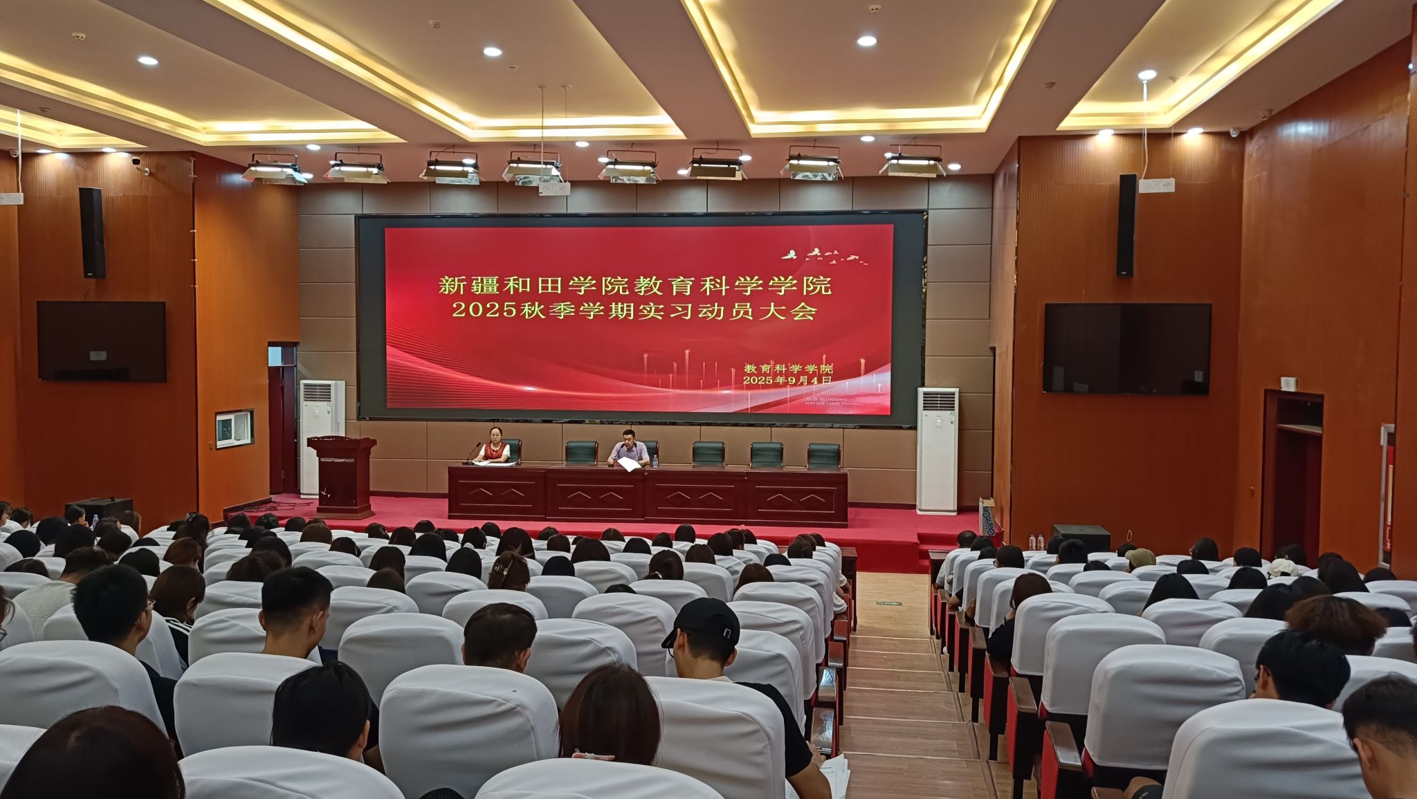新征程鼓舞人心,新实践催人奋进。为确保实习工作安全有序开展,引导学生充分做好实习准备,明确考核标准,保障自身安全,9月4日,教育科学学院2025年秋季学期实习动员会在和田县昆仑路校区和和田市北京路南校区举行。教育科学学院领导、实习班主任、辅导员及743名实习学共同参与了此次大会。此次大会对教育科学学院实习学生分配情况如下:743名学生参加实习,分别是和田市 346 名、和田县 71 名、皮山县 55 名、墨玉县 58 名、洛浦县 50名、策勒县 54 名、于田县 57 名、留校实习 17 名;自主实习 35名,本次安排 10 名指导教师参与实习指导,其中教育科学学院2名。