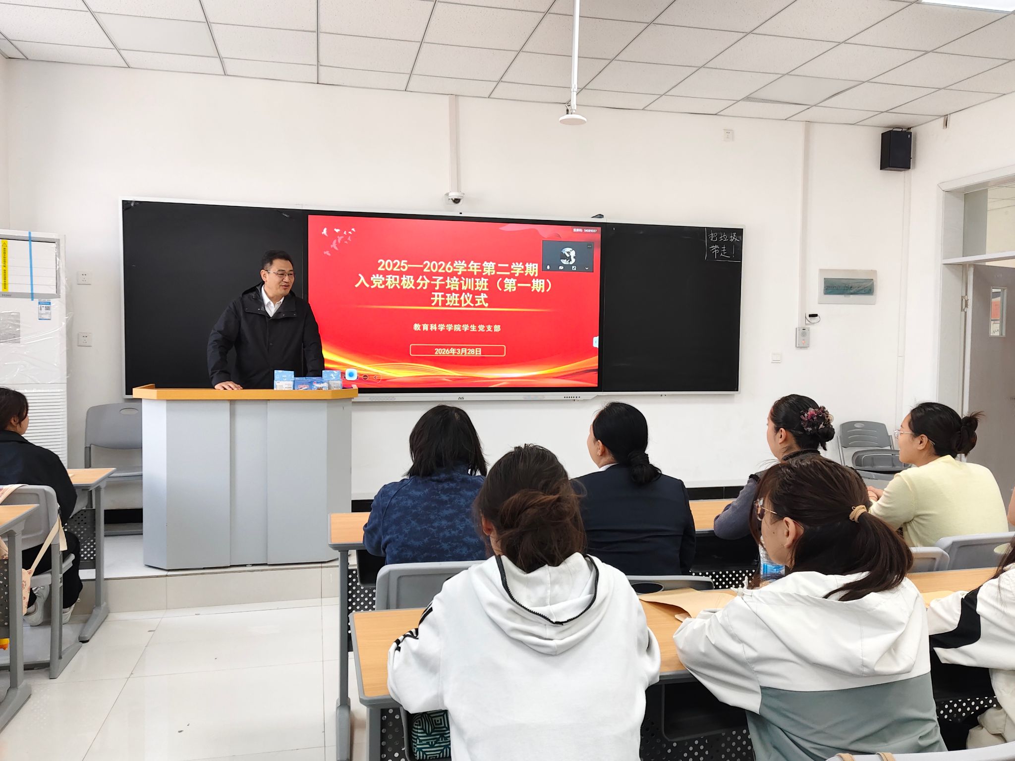 为深入学习贯彻习近平新时代中国特色社会主义思想,加强入党积极分子培养教育,提升学员政治素养与党性修养,教育科学学院学生党支部于2026年3月28日至4月3日,举办2026年第一期入党积极分子培训班。3月28日上午,丁永为副院长作开班动员讲话,深刻阐明举办入党积极分子培训班的重要意义,对全体学员提出明确要求与殷切期望。